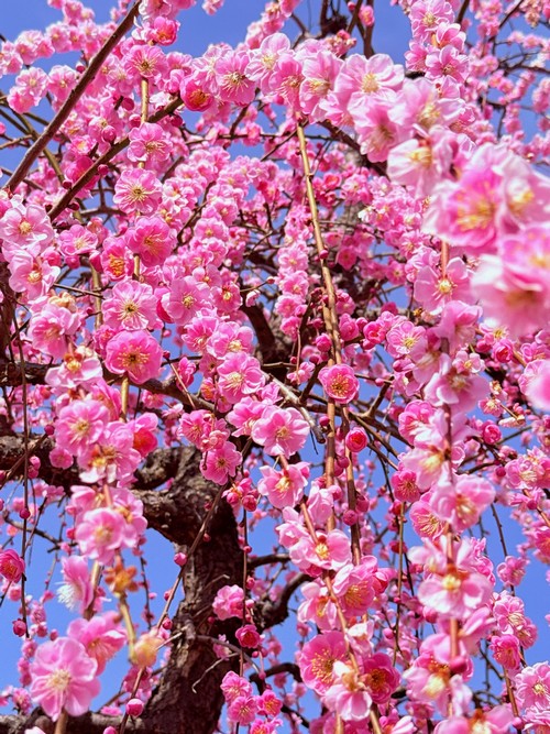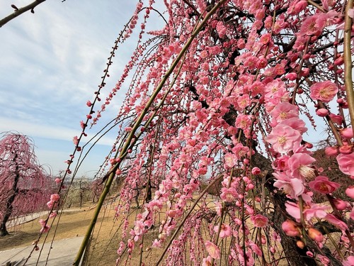 しだれ梅園は2026年2月14日(土)~3月22日(日)開園です。例年、2月下旬から3月上旬にかけて見頃を迎えます。