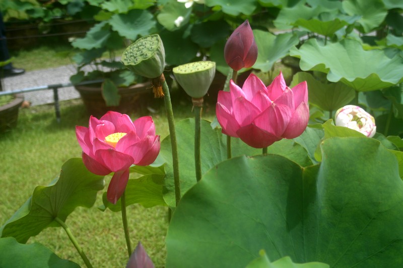 変わってハスの季節となりました。午前中は色とりどりのハスが競い合うように咲き乱れます。