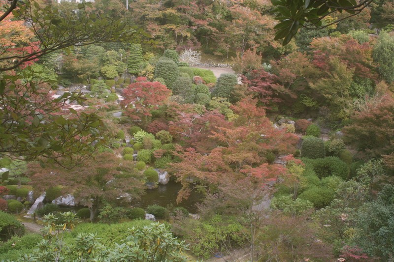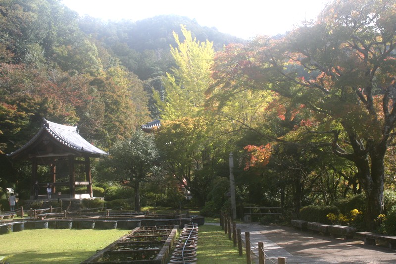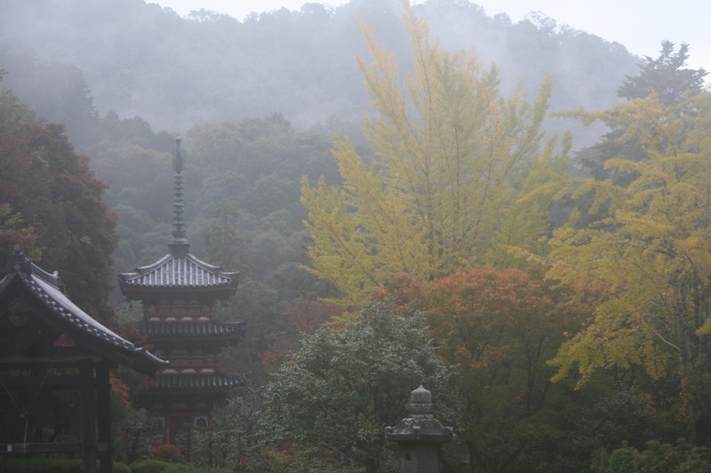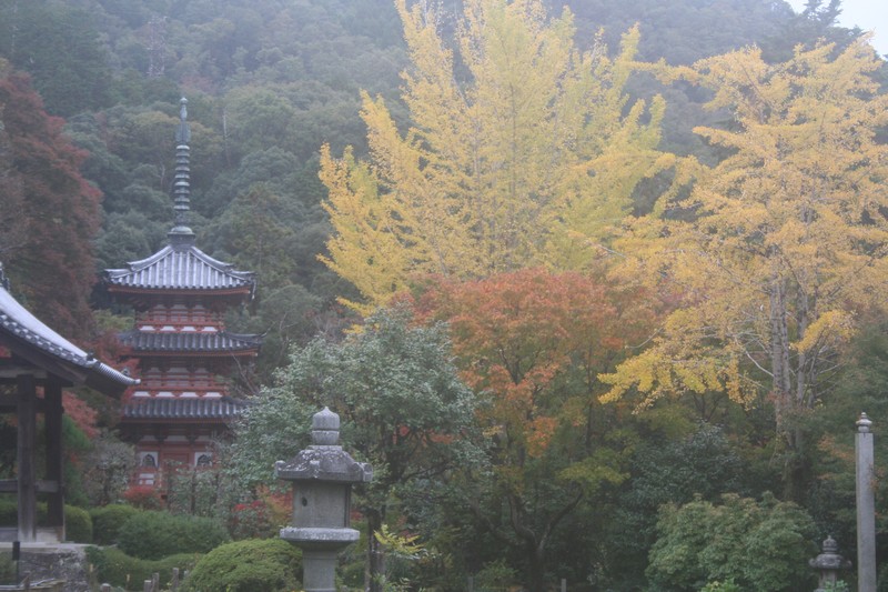 三室戸寺の紅葉が相当すすんでいます。イチョウは黄色みを帯び、ドウダンツツジは赤みが増してきました。