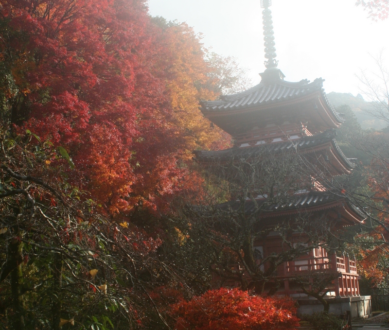 三重塔周辺のイチョウはハラハラと葉をちらしはじめました。変わって山側のモミジが赤く染まり始めました。