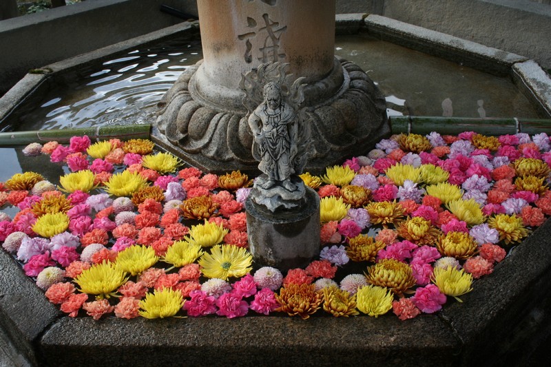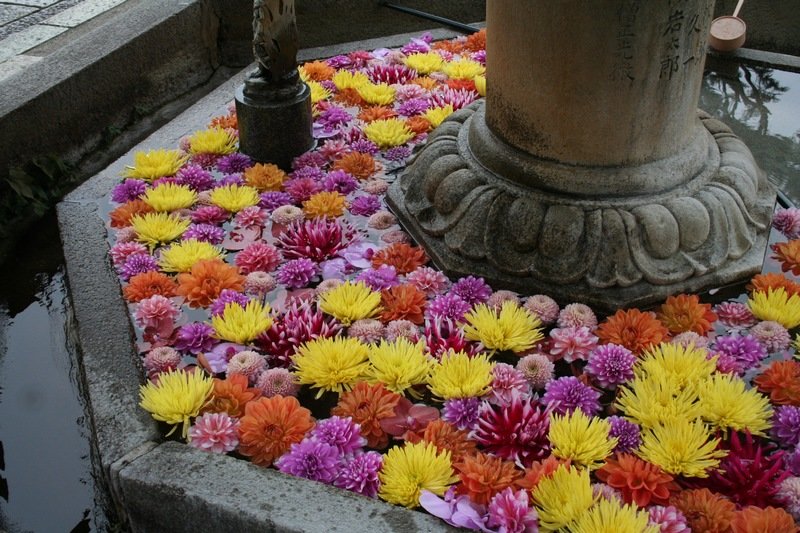 JR東海協力による花手水が人気で、多くの方が写真撮影されています。およそ200輪の菊、カーネーションなどがおおきな手水に浮かんでいます。
