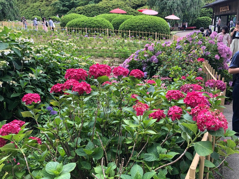 赤色のアジサイの色がのってきました。またハスも次々と開花しこれからはアジサイとハス、両方楽しめます。