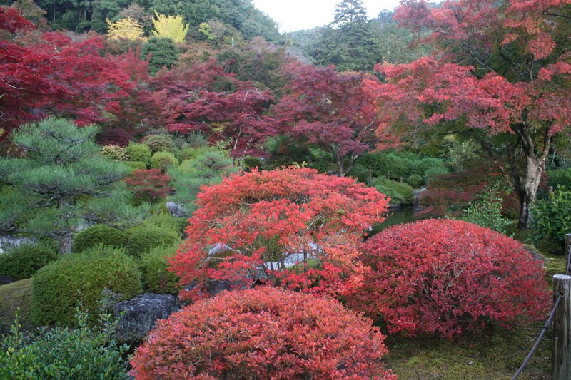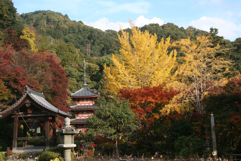 三重塔周辺のモミジが燃えるような赤になりました。月末までが見頃でしょう。