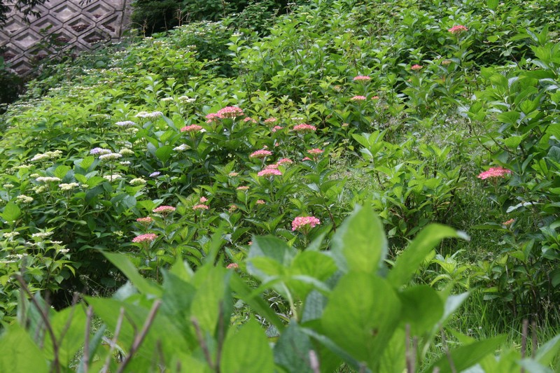 暑さと強烈な日差しを受けて、アジサイ昇龍図もぐったり。雨が待たれます。庭園のアジサイも5分咲きとなっております。