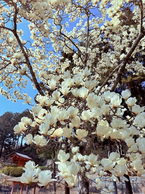 気温が上がり、春の花が咲き始めました。ハクモクレン、アセビの花、雪柳。