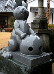 三室戸寺本堂前に狛牛と対面して兎が安置されています。